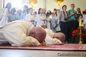 Пасля гаміліі іерарх звярнуўся да кандыдатаў у пасвячэнне з пытаннем, ці гатовыя яны прыняць сакрамант святарства. Калі браты далі станоўчы адказ, распачаўся ўласна сам абрад пасвячэння. Спачатку браты Ігар і Максім леглі крыжам перад алтаром, а вернікі разам са святарамі маліліся Літаніяй да Усіх Святых.