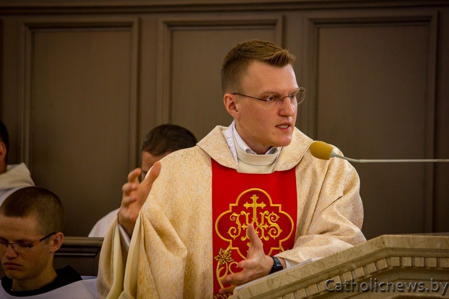 Падчас гаміліі а. Павел Раманчук засяродзіў увагу на асобе святога Максіміліяна Марыі Кольбе, які ў 1917 годзе з мэтай навяртання грэшнікаў, а таксама асвячэння ўсіх душаў праз заступніцтва Панны Марыі, заснаваў таварыства «Рыцарства Беззаганнай». У 1927 годзе ў Польшчы ён распачаў будаўніцтва кляштара-выдавецтва Непакалянаў. У 1930 годзе а. Максіміліян выехаў на місіі ў Японію і заснаваў там кляштар «Сад Беззаганнай». Падчас Другой сусветнай вайны святы быў арыштаваны і замучаны ў канцлагеры Аўшвіц-Біркенаў 14 жніўня 1941 года. Максіміліян Марыя Кольбе лічыў, што самае галоўнае ў жыцці – стаць святым.