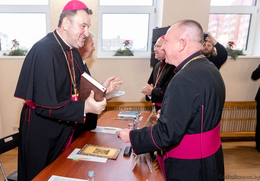 Напрыканцы прэзентацыі біскуп Аляксандр Яшэўскі ўрачыста прадставіў надрукаванае выданне «Пяцікніжжа Майсея» (Мінск, 2025) і разам з кс. Янам Крэмісам, яны ўручылі ганаровым гасцям першыя экзэмпляры кнігі.