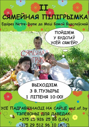 posterРух сужэнскай духоўнасці “Equipes Notre-Dame” з радасцю запрашае ўсе хрысціянскія сем’і прыняць удзел у пешай сямейнай пілігрымцы ў Нацыянальны санктуарый Маці Божай Будслаўскай.