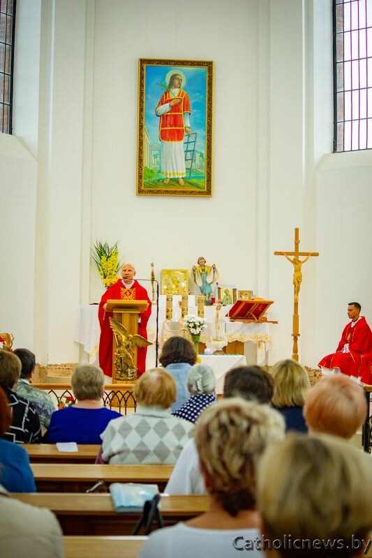 Казанне прамовіў кс. Дзмітрый Рацько. Святар распавёў пра жыццёвы шлях і мучаніцтва св. Лаўрэнція. Святы Лаўрэнцій – прыклад ахвярнасці, годны прыняцця ў якасці заступніка для кожнага верніка. Калі жорсткі імператар Валерыян загадаў яму прынесці ўсе скарбы Касцёла, святы прывёў да правіцеля вялікі натоўп бедных, хворых, убогіх, назваўшы іх сапраўдным багаццем Касцёла. За гэта яго жорстка катавалі і зажыва засмажылі на рашотцы.