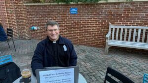 Спачатку вы чытаеце вялікія літары. Потым разумееце: гэта запрашэнне, а не рэклама. Святар пачаў евангелізаваць «на вуліцы» каля года таму. «Часам пытанні больш тэалагічныя. Часам яны больш ад сэрца», — кажа ён рэпарцёру OVS. «Часам хтосьці проста самотны і хоча пагаварыць».