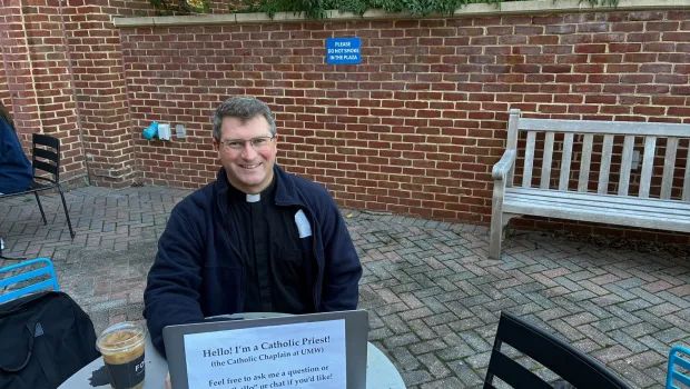 Айцец Рычард, капелан каталіцкага кампуснага служэння ва ўніверсітэце ў Вашынгтоне, сядзіць за круглым, моцна абшарпаным сталом. Тут адбываюцца размовы, як сур’ёзныя, так і менш сур’ёзныя, паміж глыткамі кавы і паездкай на заняткі.