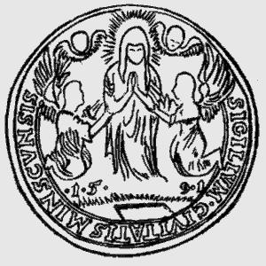 Апісанне аднаўлення Магдэбургскага прывілею з 1591 г. паказвае Маці Божую Унебаўзятую праз постаць на гербе. Яе мы можам бачыць на шматлікіх пячатках горада. Іх дакладнае даследаванне дазволіла выявіць фігуры двух анёлаў, якія рукамі падтрымліваюць Маці Божую, а таксама двух херувімаў – знак прысутнасці славы Божай. Увогуле Марыя амаль што ніколі не знікала з гарадскіх пячатак і гербаў, але мянялася кампазіцыя выявы. Так на пячатках часоў Кацярыны ІІ бачым, што Марыя велічна сядзіць на воблаку ў часе каранавання яе на каралеву неба і зямлі Святой Тройцай.