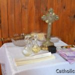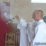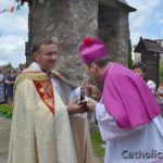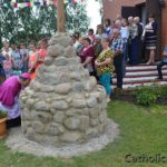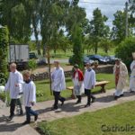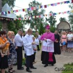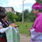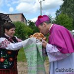 Пастыра сустрэлі каля галоўнай брамы з хлебным караваем. Каб сустрэць высокага госця, усе вернікі выйшлі з храма. Перад тым, як увайсці ў святыню, біскуп Алег асвяціў новы крыж, які ўсталяваны перад касцёлам.
