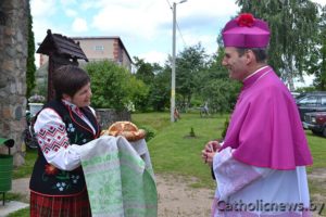 Пастыра сустрэлі каля галоўнай брамы з хлебным караваем. Каб сустрэць высокага госця, усе вернікі выйшлі з храма. Перад тым, як увайсці ў святыню, біскуп Алег асвяціў новы крыж, які ўсталяваны перад касцёлам.