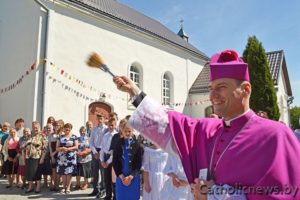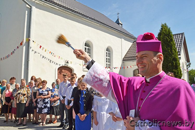 Падзеі паспрыяла надвор’е, якое выдалася ў гэты дзень проста цудоўным. Каб сустрэць высокага госця, усе вернікі выйшлі з храма. Біскупу ўручылі каравай дамашняга хлеба, а таксама кветкі. Пасля прывітання іерарх акрапіў усіх святой вадой, пажартаваўшы, што ў такі спякотны дзень вады можна выкарыстаць і больш. Затым біскуп разам з усімі вернікамі ўрачыста ўвайшоў у храм.