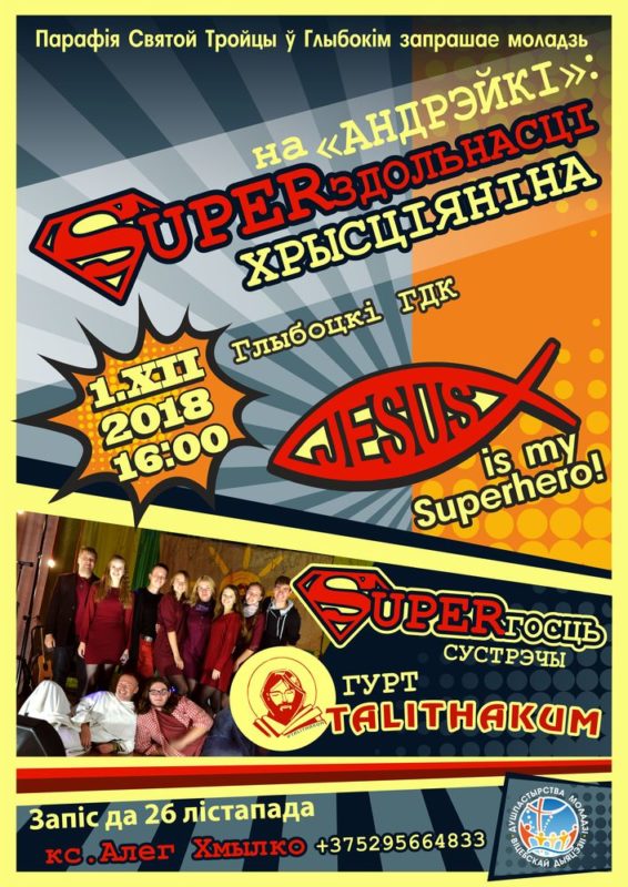 Парафія Святой Тройцы ў Глыбокім запрашае моладзь з парафій Віцебскай дыяцэзіі на музычна-евангелізацыйную праграму «Андрэйкі: Суперздольнасці хрысціяніна», якая адбудзецца 1 снежня 2018 года ў Гарадскім Доме культуры (вул. Камуністычная, 10).