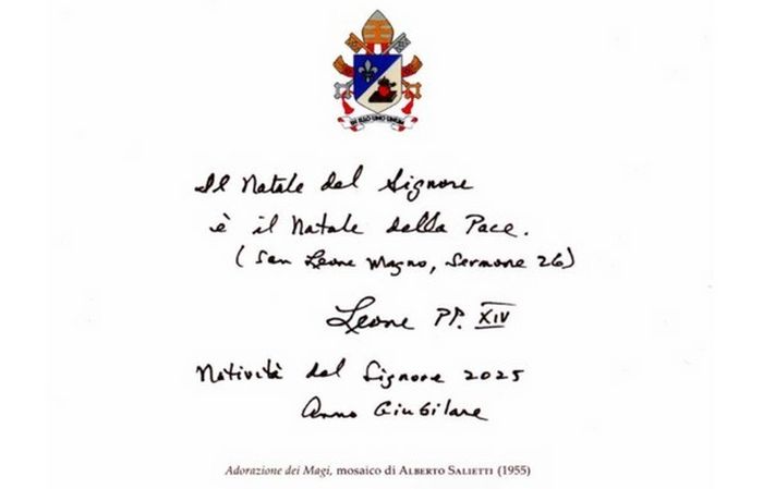 Калядным віншаваннем Святога Айца сталі словы яго папярэдніка: «Нараджэнне Госпада — гэта нараджэнне міру» (св. Леў Вялікі, Пропаведзь 26). Пад тэкстам — подпіс Папы Льва XIV і дата: Каляды 2025 года, Юбілейны год.