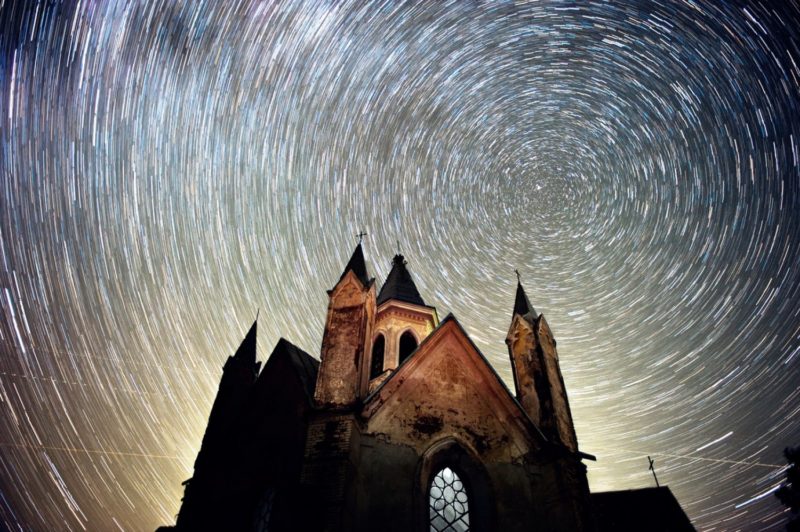 Старажытны касцёл Божага Цела ў вёсцы Багушэвічы ў Мінскай вобласці фатограф зняў у «віры» зорак. Такія здымкі атрымліваюцца з дапамогай вельмі доўгай вытрымкі або шляхам склейвання мноства кадраў, знятых з адной кропкі з інтэрвалам у некалькі секунд. Дзякуючы кручэнню Зямлі здаецца, што зоркі кружацца вакол адной нерухомай зоркі — Палярнай. Прыгожы кадр Іван Лабачэўскі размясціў на сваёй старонцы ў сацсетцы ВК.