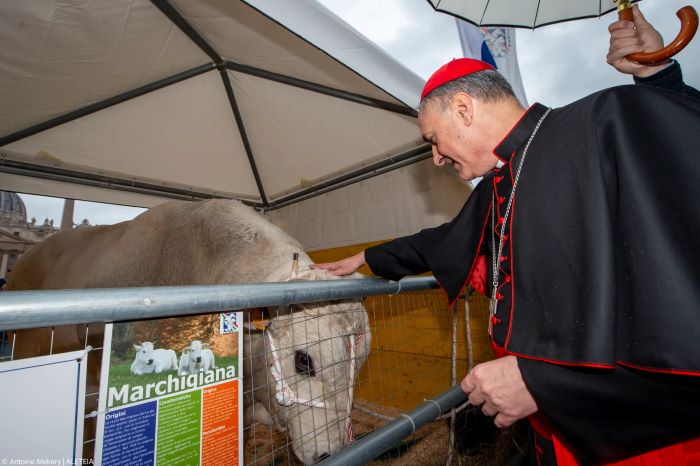 Затым кардынал Маўра Гамбэці, біскуп базылікі Святога Пятра, выйшаў на вуліцу, каб традыцыйна благаславіць жывёл. «Тыя, хто апрацоўваюць зямлю, гадуе жывёл і клапоціцца пра іх, з’яўляюцца саўдзельнікамі гісторыі стварэння […] Такім чынам яны таксама з’яўляюцца дзеючымі асобамі ў справе абароны чалавецтва», — патлумачыў кардынал.