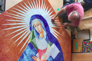Он опубликовал на своей странице в соцсети фото с описанием каждого этапа: «Роспись выполнялась высокотемпературными пигментами для керамики, обжиг на 1200 градусов. Впоследствии на лучи вокруг образа Богоматери был нанесен препарат золото для фарфора, обожженный на 800 градусов».