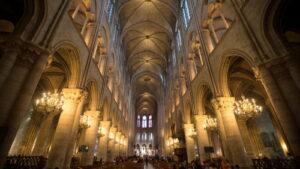 Возгорание в соборе произошло 15 апреля 2019 года в районе шпиля, причины не установлены до сих пор. Огонь полностью уничтожил деревянную крышу и сам шпиль, который упал на каменный свод и пробил его в трех местах.
