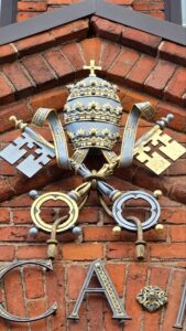 Касцёл, які атрымаў тытул базілікі, мае права выкарыстоўваць спецыяльныя сімвалы: папскія ключы і парасон (umbraculum). Менавіта гэтыя папскія ключы мы бачым над дзьвярыма касцёла. Папскія ключы – два перакрыжаваныя ключы, якія сімвалізуюць уладу святога Пятра і яго пераемнікаў, Папаў Рымскіх. Над дзвярыма таксама бачым папскую тыяру (трыкарону або папскую карону), якая азначае, што гэта святыня мае асаблівую сувязь з Папам Рымскім і ўшанавана тытулам basilica minor.