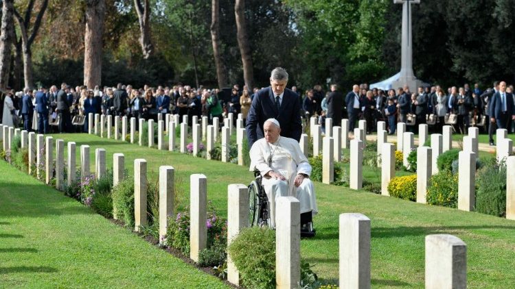 У літургічны ўспамін Усіх памерлых вернікаў, 2 лістапада 2023 года, Святы Айцец цэлебраваў Імшу на Рымскіх вайсковых могілках – Rome War Cemetery, молячы таксама за ўсіх, хто аддаў жыццё на войнах у нашы дні.