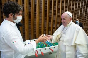 Естественно, белоснежный стол для кикера был принесен и установлен в ватиканском Зале Павла VI заранее. Тем не менее, Папа Франциск был явно обрадован этим сюрпризом и, улыбаясь, на некоторое время отдался этой любимой молодежью игре.