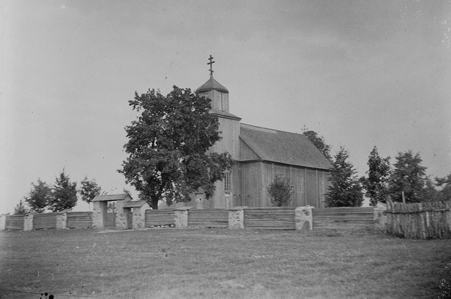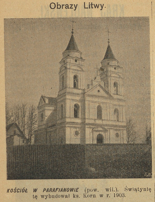 Касцёл у Параф’янаве. Злева ад новага бачны драўляны касцёл, у якім, магчыма, хрысцілі Ігната Дамейку. Фота з тыднёвіка «życie illustrowane», 1909 год.