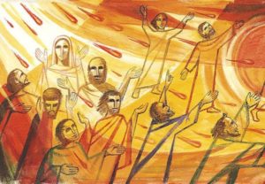 Калі быў вечар таго першага дня тыдня, і дзверы дома, дзе збіраліся вучні, былі замкнёныя ад страху перад юдэямі, прыйшоў Езус і стаў пасярэдзіне, і сказаў ім: Спакой вам! І, сказаўшы гэта, паказаў ім рукі і бок. Узрадаваліся вучні, убачыўшы Пана. Тады Езус зноў сказаў ім: Спакой вам! Як паслаў Мяне Айцец, так і я пасылаю вас. І, сказаўшы гэта, дыхнуў, і кажа: Прыміце Духа Святога. Каму адпусціце грахі, таму будуць адпушчаны; на кім пакінеце, на тым застануцца.