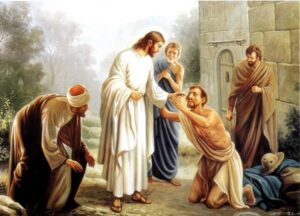 Езус, калі ішоў у Ерузалем, праходзіў праз Самарыю і Галілею. І калі Ён уваходзіў у адну вёску, сустрэлі Яго дзесяць пракажоных, якія сталі здалёк і моцным голасам казалі: Езус, Настаўнік, змілуйся над намі. Убачыўшы іх, Ён сказаў ім: Ідзіце, пакажыцеся святарам. А калі адышлі, яны ачысціліся.