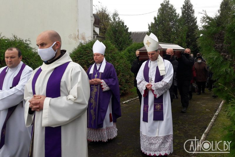 Няхай добрыя справы, якія засталіся на зямлі, адчыняць яму нябесныя брамы, і няхай выйдзе яму насустрач Найсвяцейшая Панна Марыя, якую так любіў і ўшаноўваў ксёндз Пётр, і прывядзе да аблічча Найвышэйшага», — завяршыў гамілію кароткай малітвай біскуп Аляксандр Яшэўскі SDB.