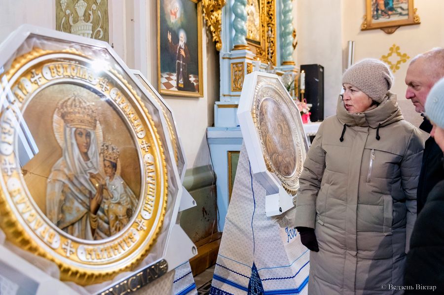 У гэты дзень прысутнічала таксама мастачка з Маладзечна Ядвіга Сенько, чыёй рукой былі напісаны прыбыўшыя спісы цудадзейных абразоў. Яна распавяла, як першапачаткова для аўтамабільнай малітоўна-пакутніцкай пілігрымкі межамі нашай краіны, якая адбылася з 12 па 18 чэрвеня 2021 года, было напісана 8 спісаў Багародзічных абразоў. У тым ліку адзін з абразаў быў уключаны па просьбе тагачаснага Апостальскага адміністратара Мінска-Магілёўскай архідыяцэзіі біскупа Казіміра Велікасельца – выява Маці Божай Гомельскай. Гэта спіс абраза Маці Божай Снежнай, аднаго з найстаражытнейшых абразоў Багародзіцы ў свеце, які захоўваецца ў Рымскай базыліцы Santa Maria Maggiore. Яго “беларускі арыгінал” размешчаны ў алтары капліцы, што знаходзіцца каля новабудоўлі – касцёла Унебаўзяцця Найсвяцейшай Панны Марыі ў Гомелі.
