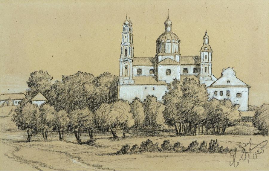 Малюнак Язэпа Драздовіча «Кармеліцкія муры». 1925 год. У левай частцы малюнка відаць капліца, пра якую ідзе гаворка ў артыкуле.