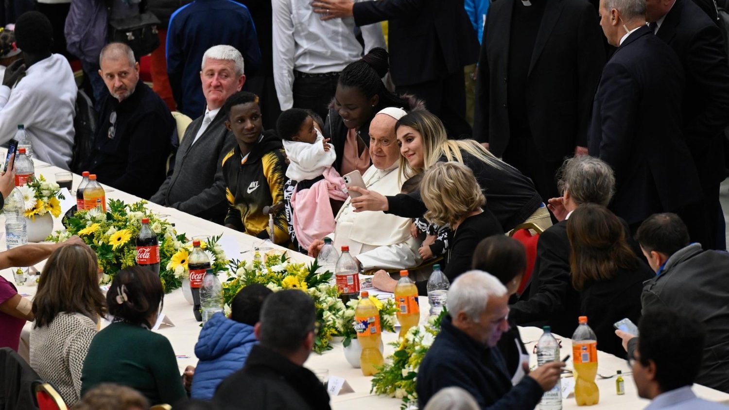 Пасля літургіі Папа Францішак сустрэнецца з беднымі ў ватыканскай Зале Паўла VI на супольным абедзе, арганізаваным Дыкастэрыяй па міласэрным служэнні пры падтрымцы Італьянскага аддзялення Чырвонага Крыжа. У якасці падарунку ўсе госці атрымаюць заплечнікі з прадуктамі харчавання і сродкамі гігіены.