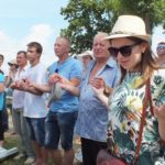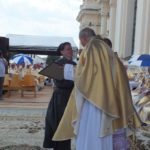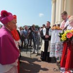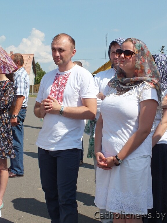 На ўваходзе ў святыню вернікі ў нацыянальным строі віталі папскага пасланніка караваем.