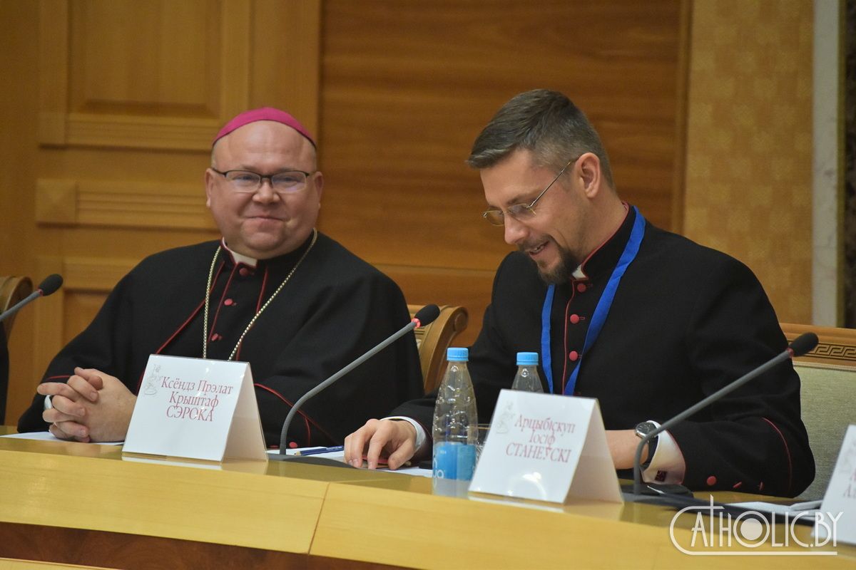 Біскуп Аляксандр Яшэўскі SDB прадставіў прысутным грунтоўны даклад на тэму «Каталіцкі Касцёл у кантэксце 35-годдзя аднаўлення яго структур». У сваім выступе іерарх прапанаваў паглядзець на гэтую гадавіну не як на сімвалічную «кропку адліку», а як на аснову для асэнсавання сучаснага этапу развіцця Каталіцкага Касцёла ў Беларусі ў святле яго гістарычнай пераемнасці і эклезіяльнай адказнасці. Біскуп адзначыў, што аднаўленне іерархічных структур напрыканцы ХХ стагоддзя — падзея, значэнне якой выходзіць далёка за межы чыста храналагічнага ці адміністрацыйнага апісання мінулага. Гаворка ідзе пра вяртанне мясцоваму Касцёлу паўнаты яго эклезіяльнай суб’ектнасці пасля дзесяцігоддзяў, калі ён існаваў без прававой кананічнай іерархіі, без належнай юрыдычнай абароны і без магчымасці адпаведнага пастырскага функцыянавання: