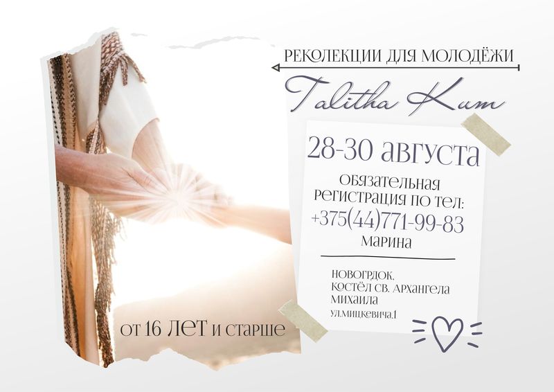 28-30 жніўня ў Навагрудку пры касцёле св. Арханёла Міхала (вул. А. Міцкевіча 1) адбудуцца рэкалекцыі для моладзі “Talitha Kum”.