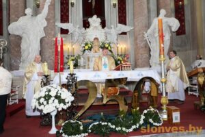 Біскуп з удзячнасцю ўзгадаў пра святароў, чыімі стараннямі слонімскі касцёл у 90-я гады быў адноўлены і якія служаць у ім сёння, “штодзённа будучы жывы Касцёл – супольнасць вернікаў, якая прабывае з Хрыстом і рупліва ахоўвае веру продкаў”. Акрамя таго, ён заахвоціў дзякаваць Богу за ўсіх, хто ўтварае гэтую парафіяльную супольнасць.