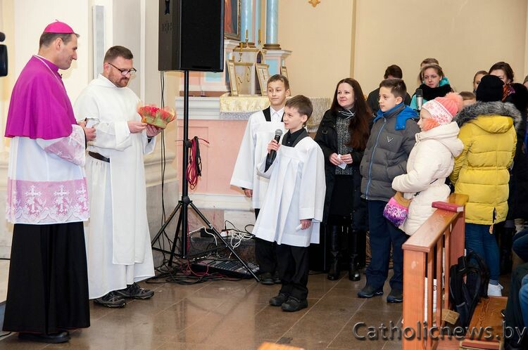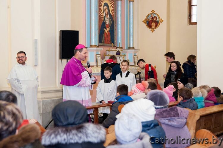 Распачаўся душпастырскі візіт сустрэчай з дзецьмі, якія ўдзельнічаюць у занятках па рэлігіі, іх бацькамі і катэхетамі. Дзеці адказна рыхтаваліся да сустрэчы і прывіталі біскупа вясёлым спевам. Каб лепш пазнаёміць кіраўніка дыяцэзіі з тым, як адбываецца катэхізацыя ў парафіі, старэйшая дзеці падрыхтавалі прэзентацыю, якую з цікавасцю паглядзелі ўсе прысутныя ў касцёле. Пасля гэтага кожны з дзяцей меў магчымасць асабіста задаць пытанне біскупу Алегу. У часе размовы з дзецьмі, біскуп звярнуў увагу на тое, што ў касцёле зараз Адвэнт – час чакання на прыход Збавіцеля – час, які варта выкарыстаць, каб як мага лепш падрыхтавацца да сустрэчы з Езусам. А пры гэтым, перш за ўсё, трэба памятаць пра падрыхтоўку свайго сэрца на прыход Божага Сына, які народзіцца, як маленькае Дзіця. Сам Езус пажадаў быць бліжэй да нас, таму мы можам сустрэцца з Ім у сакраманце Эўхарыстыі, калі прымаем Яго ў сваё сэрца. Напрыканцы сустрэчы дзеці падзякавалі біскупу Алегу за сустрэчу і пажадалі Божага бласлаўлення ў працы і сіл.