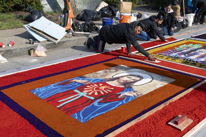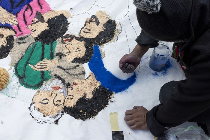 Убальдо Санчес трудился на коленях на улице вместе с 15-летним племянником Кевином и еще двумя десятками мастеров майяского племени мам, создавая из цветных опилок образ Иисуса на фоне ярко-голубого неба и прочие красочные образы. Труды начались в 5 часов утра на Страстную пятницу (29 марта) близ католического храма Святого Сердца. Художники изготовили многоцветный ковер «альфомбра де асеррин» с католическими образами и древними символами майя.