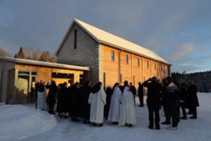 «До прошлой Пасхи мы жили в скромном доме с маленькой часовней, – поясняет в интервью CNA отец Жоэль, настоятель монастыря. – С течением времени мы начали задумываться о более основательной обители на будущее. Вот почему мы приступили к строительству монастыря и церкви в 2021 году». Новая небольшая церковь рассчитана на 40 человек максимум, она посвящена Пресвятой Деве Марии и хранит мощи мучеников и святых ордена цистерцианцев. Церковь торжественно освятили во время большого снегопада 5 декабря. Традиционный обряд освящения свершил епископ Эрик Варден из прелатуры Тронхейма в присутствии 80 единоверцев.