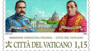 Паштовая марка вартасцю 1,15 еўра або 5 злотых была выпушчана ў двух варыянтах: з надпісамі на італьянскай і польскай мовах. На ёй размешчаны партрэты Юзафа Пілсудскага і папы Бэнэдыкта XV на фоне Бэльвэдэрскага палаца ў Варшаве і базылікі св. Пятра ў Ватыкане.