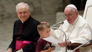 «Он храбрый, да? И остается спокойным» — сказал Папа Римский о мальчике, который получил от Франциска небольшую черную книжицу.