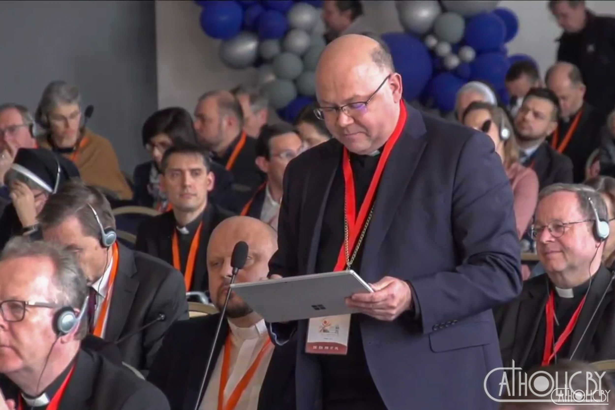 У сваёй прамове Старшыня Сінадальнай камісіі пры ККББ зазначыў тэмы, якія знаходзяць найбольшы водгук у Касцёле ў нашай краіне. Тэзісы яго выступу былі сфармуляваныя ў выніку сумеснай працы усіх біскупаў Канферэнцыі Каталіцкіх Біскупаў у Беларусі. Перадусім яны сцвердзілі, што супольнасць Касцёла ў нашай краіне з вялікай радасцю прыняла ініцыятыву Папы Францішка склікаць Сінод на тэму сінадальнасці.